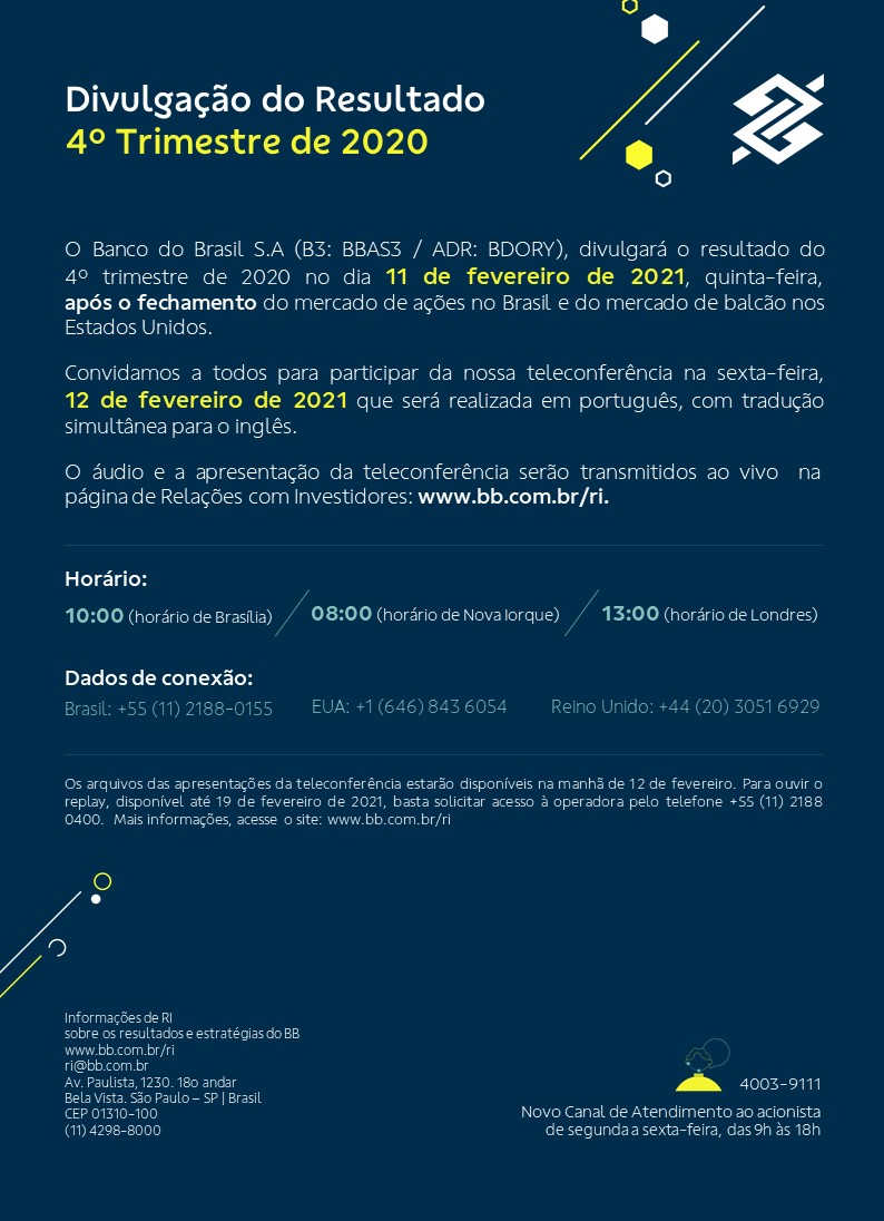Convite Divulgacao do Resultado Banco do Brasil 4T20 Gerar link Facebook X Pinterest E-mail Outros aplicativos fevereiro 08, 2021 Gerar link Facebook X Pinterest E-mail Outros aplicativos Comentários