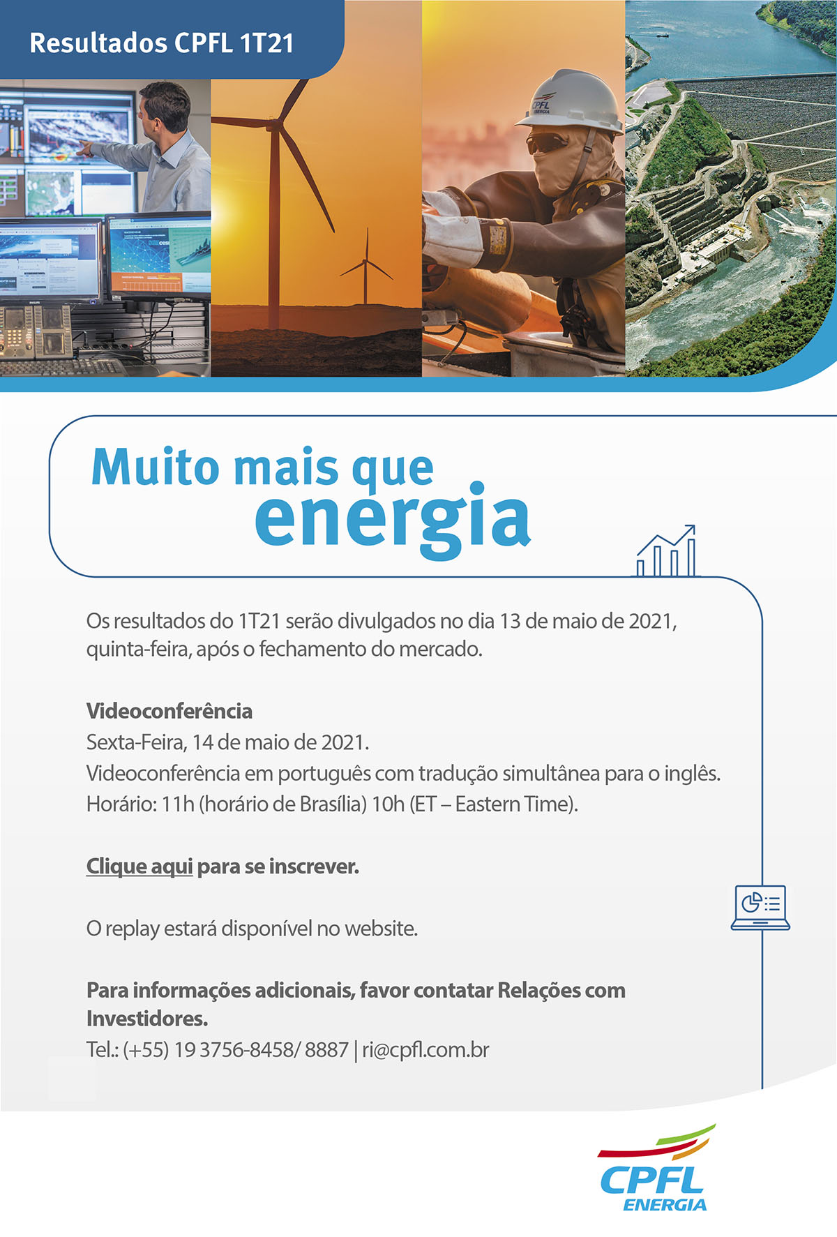 CPFL Energia: Calendário de Divulgação de Resultado 1T21 Gerar link Facebook X Pinterest E-mail Outros aplicativos maio 13, 2021 Gerar link Facebook X Pinterest E-mail Outros aplicativos Comentários
